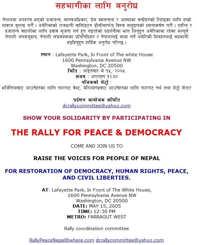 फेब्रुअरी १ को शाही-कदमको समर्थनमा डी. सी. र न्यूयोर्क मा केही पुराना राजावादीहरु, केही नवराजावादीहरु र केही आफु राजावादी नभएको तर बहुदलिय प्रजातन्त्रबाट मोहभंग भएको भन्ने शान्तिकामीहरुले गरेको ससाना प्रदर्शनलाई उनिहरुले "हजारौंले भाग लिएको विशाल पदर्शनहरु" भनेर नेपालको सरकारी संचारबाट प्रचार गराए । आजसम्म पनि नेपालबाट साथीसंगीहरु सोध्ने गर्छन्, के साच्चै अमेरिकाका सबै नेपालीहरु राजाको कदमको समर्थन गर्छन ? र यस्तो प्रश्न मलाई मात्र होईन मैले कुरा गर्न पाएका लगभग सबै अमेरिका-सहवासीहरुलाई नेपालका उनिहरुका आफन्तहरुले सोध्ने गर्दा रहेछन् । भनेसी प्रोपेगाण्डा कार्यमा अमेरिकाका राजावादीहरुले क्षणिक नै सही तर ठूलो उपलब्धी हासिल गरेछन् । प्रोपेगाण्डाको लागि सरकारी मात्र हैन गैरसरकारी माध्यम समेत प्रयोग गरे आयोजकहरुले । 'नेपाली टाईम्स' मा एकजना आयोजक महोदयले डी. सी. को प्रदर्शनलाई 'बहुसंख्यकहरुको प्रतिनिधित्व' (majority representation) भनेर दावी गरे । स्वतन्त्र माध्यमबाट गरिएका यस्ता पुटले 'राजमुकुट प्रति प्रतिबद्ध' सरकारी माध्यमहरुले गरेको प्रचारका अविश्वसनियतालाई कम गरे हुनन् । एनिवे, "के साच्चै अमेरिकाका सबै नेपालीहरु राजाको कदमको समर्थन गर्छन ?" भन्ने नेपालका आफन्त संगीसाथीहरुको प्रश्नको उत्तर दिंदा दिंदा हैरान हुनु भएका प्रजातन्त्रप्रेमी साथीहरु डी. सी. को नजिक हुनुहुन्छ भने यही Sunday, May 15, 2005 का दिन White House अगाडि हुने Pro-Democracy Rally मा पाल्नुहोला । नेपे जरुर उपस्थित हुनेछ त्यहाँ तपाईहरुसंग न्यानो अभिवादन साटासाट गर्न ।