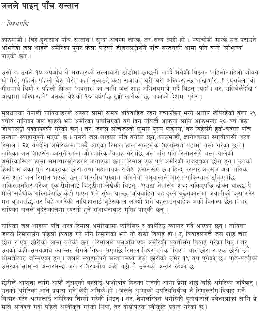 Congratulations to Jal Shah and Mr. Rimal. May they have happy lives ahead. ************ In Nepal, donor agencies spend MILLIONS of dollars ever year doing what they call 'sensitizing' Nepali professionals about 'gender issues'. Likewise, a number of donor agencies spend hundreds of thousands of dollars every year on 'sensitizing' media professionals about various issues such as gender, conflict, peace and what have you. As a consumer of newspapers, I have NO idea how effective these donor-sponsored training programs, junkets and workshops are, though I have some good idea that many Nepali journalists live off donor funds to run their various media-related NGOs. As I -- a consumer of news -- often joke with Basanta Thapa, Himal patrika's Ritu Raj columnist,"Given the amount of foreign aid money thrown at Nepali journalists for this and that every year, why is that a majority are, well, overtrained and underskilled?" The above report, given its khattam-ness, jhoor-ness and utterly disrespectful/derogatory (from every sense) comments about Jal Shah shows that Nepali journalists still have a lot of learning to do when it comes to reporting personal/professional details of a well-known Nepali actress. Oh well. More later. oohi ashu