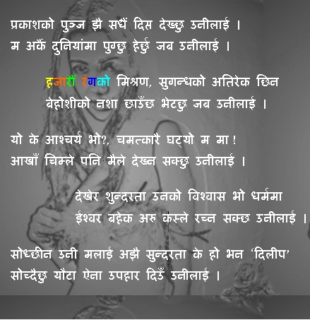 Gajjab "feeling" cha lou Dilip jee. Here is one I am working on. आफ्ना बिरुद्दका नाराहरु सुन्दैछु ॥ कम धारिला कुन छन् चुन्दैछु ॥ अग्र पंक्तिमा हुंदा पनि कहीं पुगिनं गन्तब्य अब झोला भित्र थुन्दैछु ॥ कुचाहरु नै हातहरु शत्रु-मित्रका म दरवार बनाउन जालो बुन्दैछु ॥ आफ्नै स्वविवेकले गर्दा धेरै लडें बस् चुकेका अबसरहरु गुन्दैछु ॥