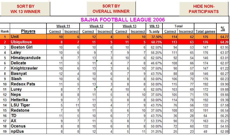 OK Guys: Here's the Updated Scoreboard.... The SFL 2006 Overall winner so far is UNIT The SFL 2006 Week 13 winner is UBIQUITOUS This is my first attempt. So, if you find any errors in your scoring, let me know. Oceanus: You had 2 predictions for the same week. I used the first one. Those of you who missed the Thursday's match, your score is adjusted accordingly. (If you didnot see your name on the scoreboard, that means you had no predictions for Wk 13). If you put in your predictions for following weeks, I will tally them as we go forward.)