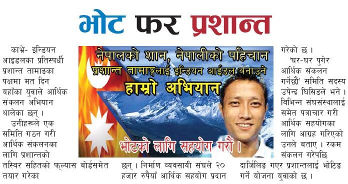 भारतीय टेलिभिजन सोनीबाट प्रसारित 'इन्डियन आइडल' का एक प्रतियोगी प्रशान्त तामाङ नेपालीका लागि अपरिचित नाम रहेन । शुक्रबार रातिको कार्यक्रममा जब उनी रोए, उनीस“गै लाखौं नेपाली रोए र रातभर जागा भई तिनै नेपालीभाषी छोरालाई जिताउन लागिरहे ।