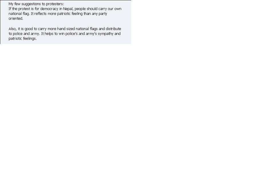 NOTE: The opinions here represent the opinions of the individual posters, and not of Sajha.com. It is not possible for sajha.com to monitor all the postings, since sajha.com merely seeks to provide a cyber location for discussing ideas and concerns related to Nepal and the Nepalis. Please send an email to admin@sajha.com using a valid email address if you want any posting to be considered for deletion. Your request will be handled on a one to one basis. Sajha.com is a service please don't abuse it. - Thanks.