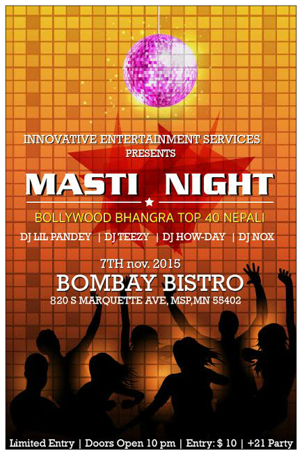 Innovative Entertainment Services Presents "MASTI NIGHT" DJ NOX, DJ TEEZY, DJ HOWDAY AND DJ LILPANDEY behind the decks spinning the hottest Bollywood/Bhangra/top 40 and Nepali dance tracks.When : NOVEMBER 7th, 2015, 10 PM onwardsWhere: BOMBAY BISTRO, 820 S Marquette Ave, Minneapolis, MN 55402.21 to Party | Dress to Impress | $10 at the door | Drink specials all nightFor Sponsorship or other info please contact: 612-643-1441 651-505-3561 ientertainmentservices@gmail.comEvent Link: https://www.facebook.com/events/536838743131246/